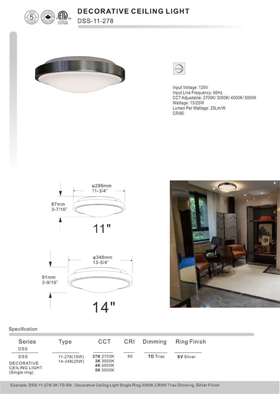 LED Dimmable 11" Decorative Ceiling Light Single Ring 120V 15W DSS-11-278-15W